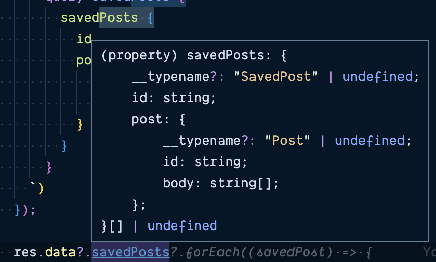 Once types are generated this would show typescript hints just as you would receive with seperate hooks or a generated sdk.